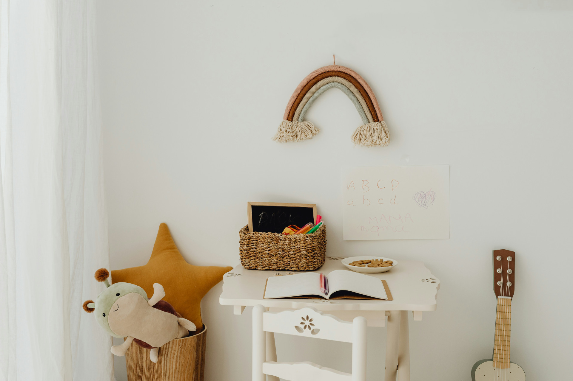 - Δημιουργική γωνιά: Ένα μικρό τραπέζι με υλικά για ζωγραφική ή κατασκευές, πίνακας ανακοινώσεων ή ράφι για τις δημιουργίες του παιδιού.